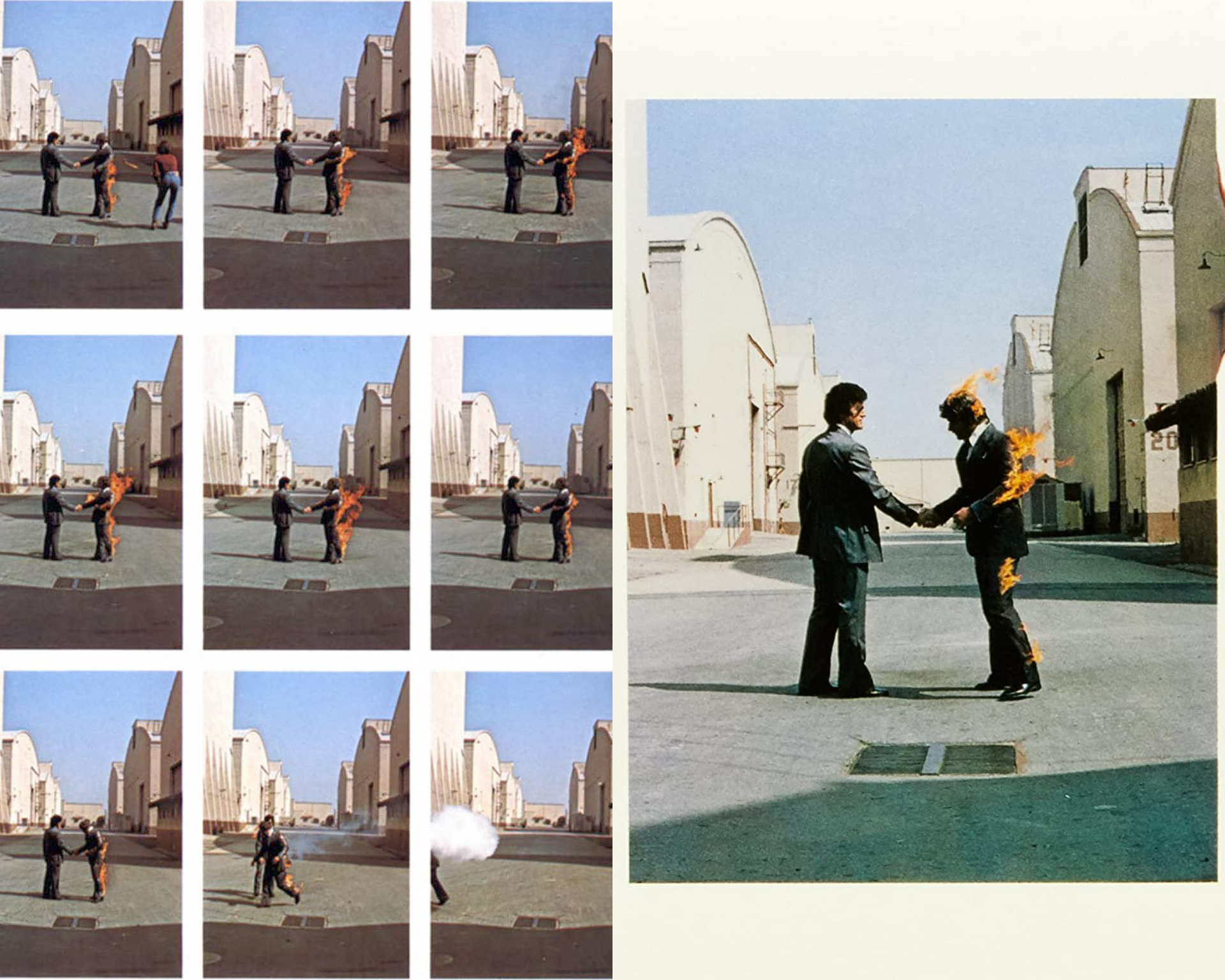 Diferentes tomas y fotos del proceso de creación de la portada de Wish you were here de Pink Floyd y portada final. Si hay que quemar a alguien para conseguir ese efecto, hagámoslo. Hasta ese punto llegaba el grado de creatividad y compromiso de Hipgnos