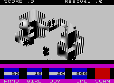 • El objetivo era encontrar y rescatar a la chica (o al chico si llevabas a la chica). Sandy necesitó diseñar una rudimentaria IA para que el rescatado siguiera al jugador e incluso se encaramase por los bloques si le hiciese falta.