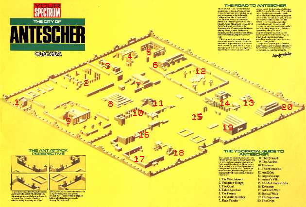 Mapa esquemático de la ciudad de Antescher publicado en 1983 por la revista británica Your Spectrum. Muestra la veintena de edificios diseñados por Sandy y Angela.