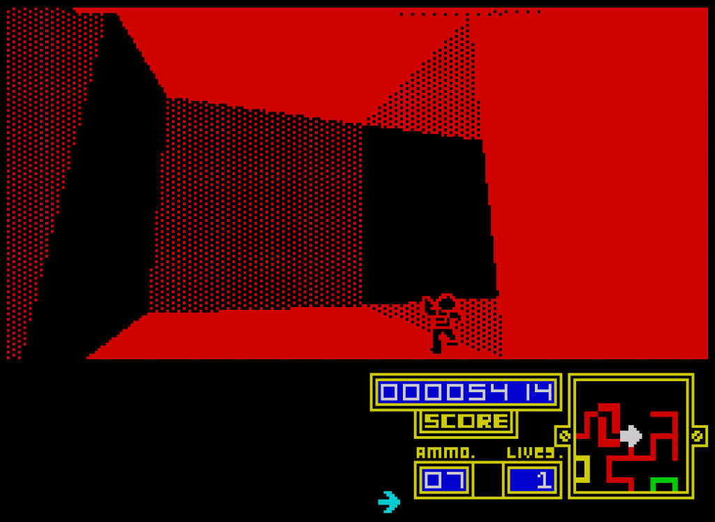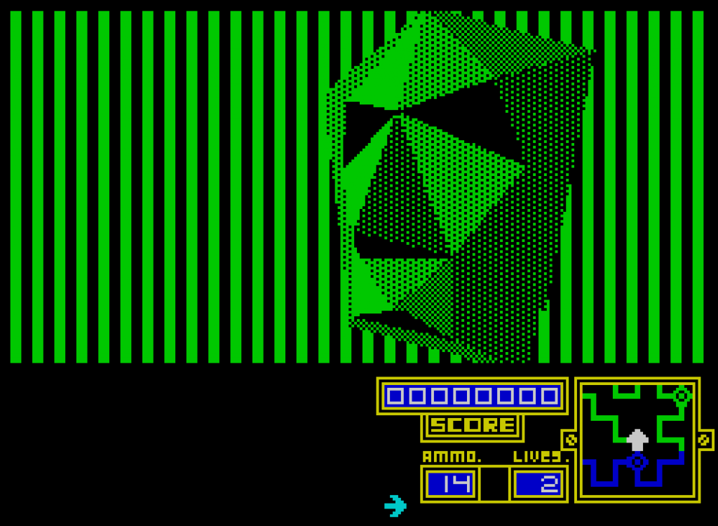 I, of the mask es una de esas escasísimas piezas de arte que parece que alguien trajo del futuro con una máquina del tiempo. Sencillamente aquel juego no tenía sentido en 1985. Por explicar un poco la mecánica, controlamos a un extraño personaje que se mueve por unos coloridos y angostos pasillos completamente en 3D… ¡Y con sombreados! Siguiendo un pequeño mapa, debemos acceder a unas zonas especiales donde tras resolver un pequeño puzle, obtendremos una pieza de un estrambótico robot hasta completar su última pieza, la máscara, pero todo ello ambientado a base de sonidos cacofónicos y con una atmósfera muy opresiva. Absolutamente rompedor para un Zx Spectrum de tan sólo 48 KB.