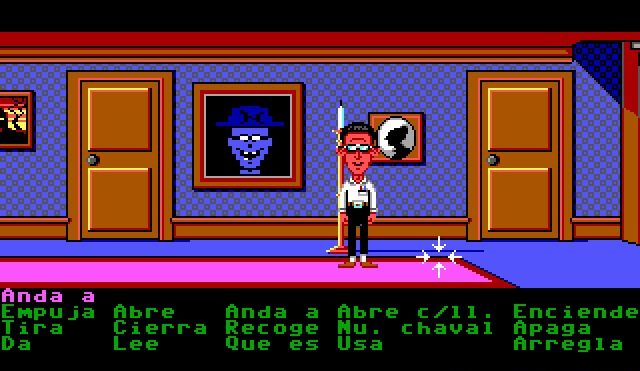 Después de esta introducción tipo nerd, pasemos a hablar del juego en cuestión: Maniac Mansion. Salió en formato PC en el año 1988, aunque lo hizo ya el año anterior en Commodore 64, y, como siempre, en España, otro añito después. ¡Demonios! Hasta la consola Nintendo tuvo una versión de este juego (una auténtica basura censurada por todas partes donde hasta quitaron una estatua que salía desnuda). El juego fue producido por la compañía estadounidense Lucasfilm Games (filial de la productora de George Lucas; actualmente, Lucasarts) y fue diseñado por Ron Gilbert y Gary Winnick, que se convirtieron a raíz de esto en estrellas mundiales del videojuego, lo que da una ligera idea de la repercusión del mismo. Hubo incluso una serie de televisión inspirada en el juego, una mierda asquerosa sin pies ni cabeza, que además no tenía nada que ver con la obra maestra de Lucasfilm. La trama del juego quizá no está a la altura de lo esperado: el doctor Fred rapta a tu novia del instituto y se la lleva a su laboratorio secreto oculto en algún lugar de su tenebrosa mansión. Reclutas a dos amigos tuyos, a elegir de un total de seis, y marcháis a rescatarla. Luego descubres que, en verdad, el tal Dr. Fred es un tío normal que está sometido al control mental de un meteorito alienígena que cayó diez años antes. Vamos, un rollo ciencia ficción serie B, pero que molaba un puñao.